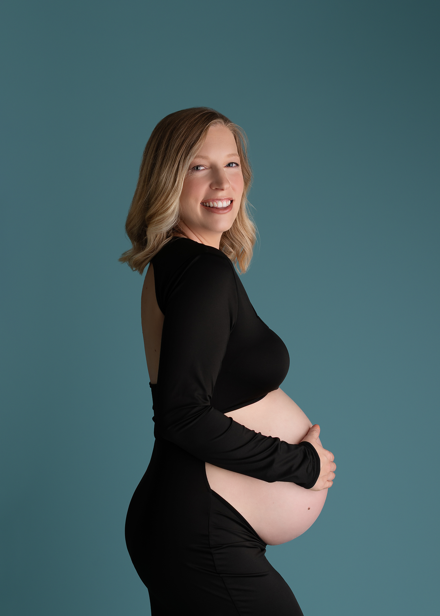 Black and Emerald Velvet Bodysuits shown here add variety to your Maternity Session. The backs of these bodysuits can be clipped to fit a smaller Mama.